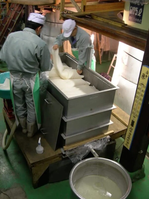 首先,發酵完成的醪,必須經過「上槽(Joso)」這個步驟,也就是我們常說的「搾り(Shibori)」,把清酒與酒粕分開。在參觀時,你會看到兩種構造不同的設備:
