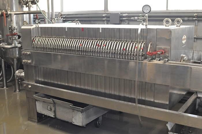 這是現代酒造的主流,外觀像是一台巨大的手風琴,由數十片濾板組成。它的優點是密閉(減少氧化)、快速且高效,能壓榨出非常清澈的酒液。而我自己在看這個設備的時候,通常會注意兩個點,一是是否位於冷氣房中作業,因為這對於保留易揮發的吟釀香氣(如乙酸異戊酯、己酸乙酯)相當關鍵。另外一個就是觀察濾布是否有黑點以及是否使用臭氧機清洗濾布。因為濾布上殘留酒粕去除之後,殘糖量相當高,要是清洗不乾淨,將來就容易發黴,甚至在酒液中產生TCA, TBA。