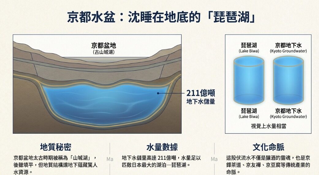 要理解京都的酒,就必須先了解伏見的酒,而要了解伏見的酒,必須先理解伏見的「水」。京都盆地的地理形成可以追溯到太古時期,當時這裡被稱為「山城湖」,是一個巨大的湖泊 。隨著時間推移,土砂堆積形成了盆地,但仍遺留下了巨大的「巨椋池」。雖然巨椋池在昭和16年(1941年)被填平並轉化為農地與住宅區,但其地質結構使得京都盆地蘊藏著驚人的水資源 。