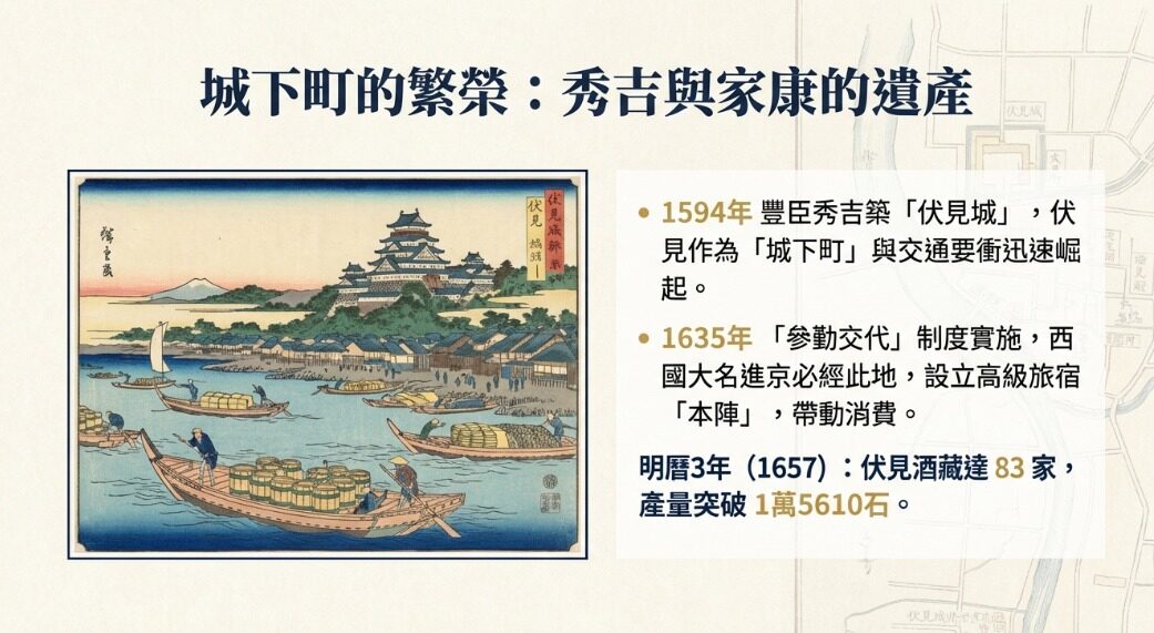 而伏見真正作為一個大規模的釀酒產地,應該是從1594年豐臣秀吉在伏見指月建造「伏見城」開始算起。建城兩年後,指月伏見城雖因大地震倒塌,但豐臣秀吉隨即在東北的木幡山重建,然而卻又在慶長5年(1600年)關原之戰的前哨戰中再次被攻陷 。直到1602年,德川家康再次重建伏見城,一直到元和9 年(1623年)廢城為止,伏見一直作為「城下町」而繁榮興盛 。
