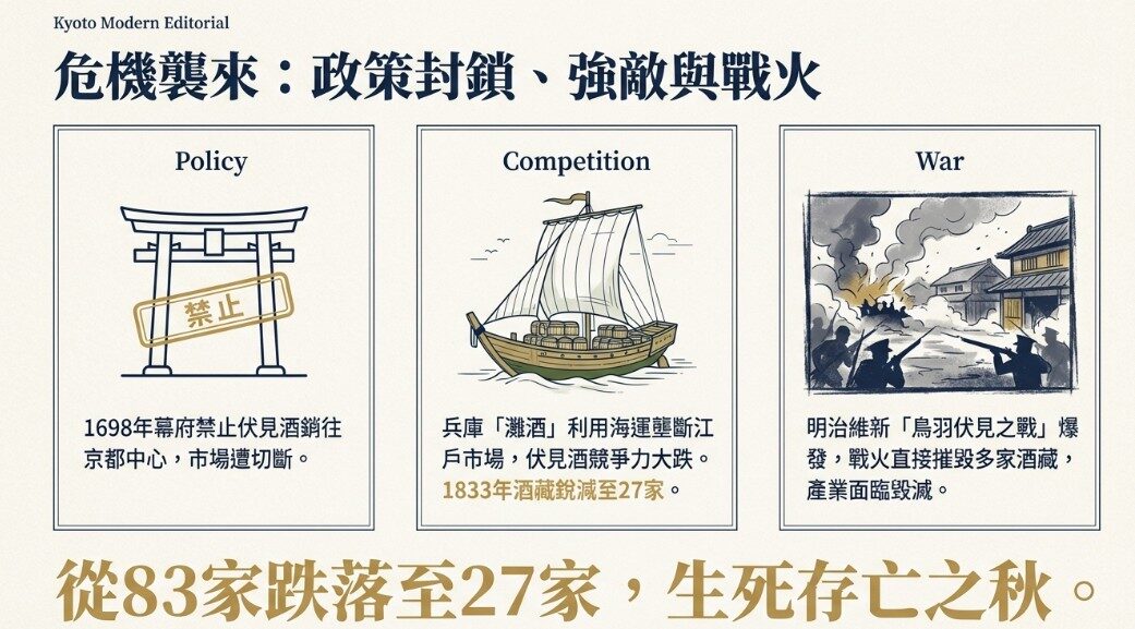 而第三個原因則是因後來發生的明治維新「鳥羽伏見之戰」,讓多家酒藏遭受戰火波及,產業受到了毀滅性打擊 。