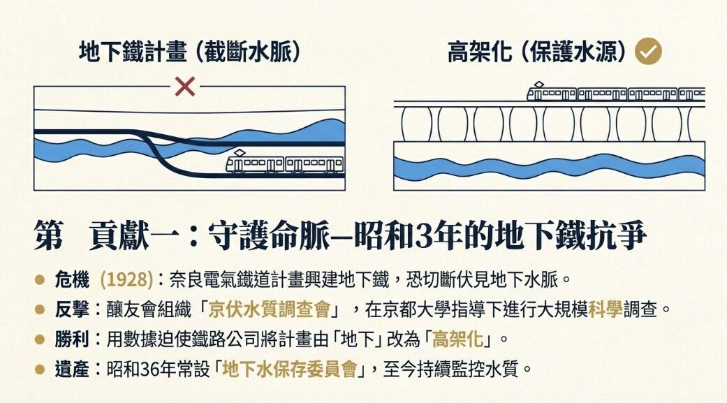 伏見釀友會守護水源最著名的事件是昭和3年(1928年)奈良電氣鐵道計畫在「桃山御陵前」至「京都」區間建設地下鐵。伏見釀友會察覺到這可能會切斷或汙染伏見的地下水脈,於是迅速組織了「京伏水質調查會」。在京都大學松原教授的指導下,他們進行了大規模的地下水流向與水質調查,並以數據向鐵路公司與政府陳情,強烈要求變更工法。最終,鐵路計畫由地下改為高架化 。今日伏見所有酒藏仍能汲取到優質的地下水,就是來自這場抗爭的成果 。