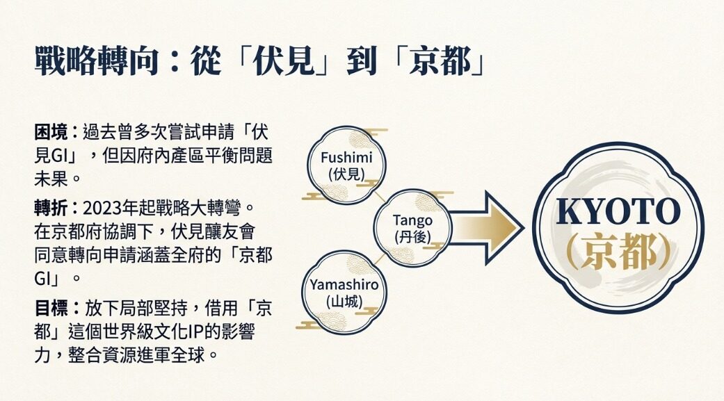 過去,伏見地區曾多次討論要申請「GI伏見」認證,但受限於京都府內與其他產區的平衡以及各酒藏的考量不一,始終未能成案 。到2023年起,這個計劃有了大幅轉變,在京都府的協調下,伏見釀友會開始同意將GI申請轉向尋求範圍更大且涵蓋整個京都府的「京都GI」認證,希望借助「京都」這個世界級品牌的影響力,有效整合資源。