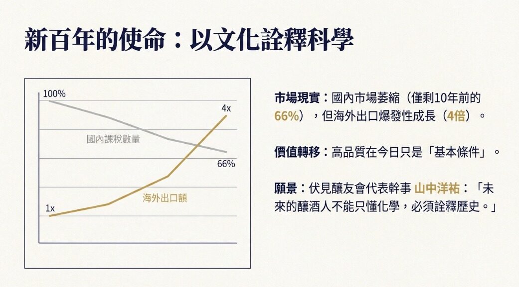 面對這樣的局勢,伏見釀友會代表幹事山中洋祐認為,酒造過去追求的是生產高品質的酒,但在現今市場,高品質只是「基本條件」,為了讓日本酒在國內復興並在海外成長,必須將「文化」、「歷史」這些無形的價值,重新疊加在產品上。這也意味著,未來的釀酒人不能只懂化學與微生物,還必須面對並詮釋酒背後的歷史與文化,而這將是伏見釀友會下一個百年的新使命。