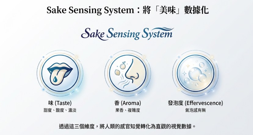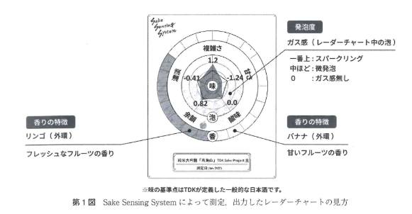 TDK於2017年啟動了「Sake Sensing System (SSS)」這個專案,其核心目的就是透過科學方法將風味「數據化」與「視覺化」,希望讓酒造與消費者之間建立共通的語言,並且希望能擴大「對清酒有興趣但不知如何選擇」的潛在客群 。Sake Sensing System最終會輸出一個雷達圖,並涵蓋了構成日本酒的三大關鍵 :