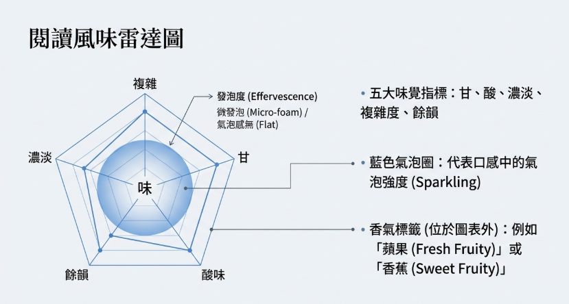這是目前比較少見的將「氣泡感」納入標準視覺化指標 。雷達圖中心的氣泡大小代表二氧化碳含量: