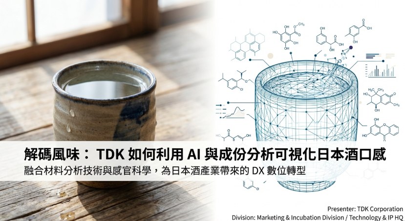 TDK將過去在製造積層陶瓷電容(MLCC)或鋰電池(LIB)時,所需要分析的塗料、分散劑、溶劑等有機材料的設備與方法,直接應用在日本酒上,並針對日本酒中的化合物進行定量分析,包括了