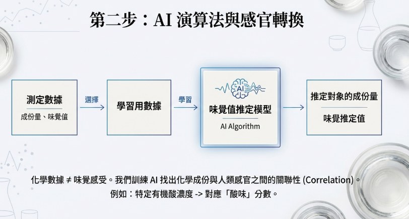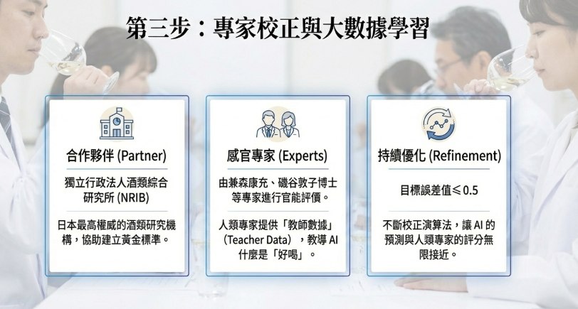 首先,TDK利用儀器測量出挑選出來的各式日本酒來獲得化學成分數據,接下來由AI針對化合物之間的相關性分析與NRIB的專家意見挑選出影響風味的關鍵成分。最後再利用累積出來的正確值去訓練AI。