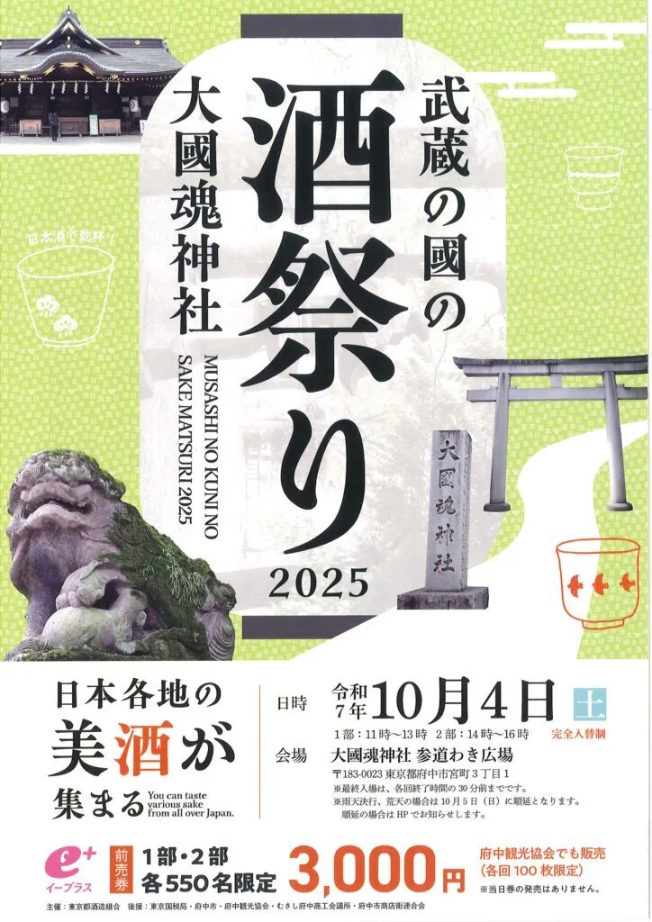 武藏之國酒祭 2025 「匯聚日本各地的美酒!」 這次的武藏之國酒祭將在東京大國魂神社內的「松尾神社」盛大舉行!除了來自全國的各式酒造與清酒,東京當地也有眾多酒造參加這次的酒祭!大部分人可能認為酒造大多座落於田野、泉水旁、山中等這些地方,但其實像東京這種超級大都市,也有許多的酷酒造座落於此喔~ 那為什麼酒祭會以武藏之國來命名呢?這就跟東京這塊土地的歷史有些淵源了。 武藏之國地理位置示意圖 武藏之國 武藏國是日本過去的行政區劃分,包括現在東京、埼玉及神奈川的一部分地區。過去的武藏國國府位於現在的府中市。府中市也因地處水陸交通要衝而繁榮發展,成為政治、經濟和文化的中心。 在國府內還設有叫做「國衙」的地點,是以辦理政務為中心的國廳在內的中心地區。經過30多年的考古發掘與調查,已確認當時的國衙遺跡就位在大國魂神社境內及東側一代,並在此發現了當時作為國廳的大型建築遺跡。 東京當地參展酒造 這次的武藏之國酒祭有相當多東京當地酒造參展,以下介紹幫助大家瞭解都市中的酒造們! 1. 豐島屋酒造 (銘柄——金婚) 豐島屋屋建於慶長元年(西元1596年),擁有400年以上的歷史。由第一代店主豐島十右衛門在地處江戶(現在的東京)中心地帶的鎌倉河岸開設,創業初期是一家賣酒兼供應飯菜的小酒館,為日本「居酒屋」的起源。 身為東京歷史最悠久的酒鋪,豐島屋本店赫赫有名的原因還有一個:那就是旗下生產的「金婚」系列,為唯一入選東京兩大神社「神田明神」與「明治神宮」的御神酒。昭和初期搬至東京都東村山市,酒廠從深達150公尺的水井中,引進富士山的伏流水釀造清酒,開啟以豐島屋酒造為名的釀酒新事業。 2. 田村酒造廠 (銘柄——嘉泉) 創立於1822年田村酒造場位於東京都福生市,坐落在多摩川河畔,面向西方群山,擁有絕佳的自然環境與清澈水源。自江戶時代起便致力於日本酒的釀造,是東京屈指可數的老字號酒藏之一。這裡的酒廠、水車小屋和石墻都是國家登錄在冊的有形文化財產。 田村酒造場秉持「不求量產、不怕繁瑣、只求精緻」的精神,以職人精神細心釀造每一滴清酒,追求「帶有田村酒造場風格的日本酒」,將傳統與細膩品質注入每一瓶作品中。 豐島屋酒造 金婚 十右衛門 純米無濾過原酒 香滑、鮮味十足、較為辛口為其特徵。有些許的蜜瓜味,餘韻清爽順喉。十右衛門正是豐島屋創辦人的名字。 冰飲、常溫、溫飲皆宜。 3. 中村酒造場 (銘柄——千歲鶴) 中村酒造場創立於江戶時代,位於東京西部的自然綠意之地——秋留野市。酒藏臨近秋川(多摩川支流),水源清澈,氣候寒冷,具備釀造優質日本酒的絕佳條件。作為東京都內少數仍活躍的歷史酒藏之一,中村酒造場至今已有逾200年歷史。 中村酒造場以「淡麗且風味兼具」為目標,致力於結合傳統技法與現代感性,製作出能與日常飲食完美搭配的酒品。 4. 小澤酒造場 (銘柄——桑乃都) 創業於1702年,小澤酒造位於東京都青梅市澤井,坐擁多摩川上游的優質水源與自然環境。主打品牌「澤乃井」以清爽柔和、香氣平衡的酒質著稱,適合搭配各式日式料理。 酒造堅持傳統釀造技法,結合現代管理,致力於釀造高品質、能與日常生活融合的清酒。代表作如「純米大吟釀 芳醸参拾伍」與「大吟釀 凰」屢獲全國新酒鑑評會金賞。 酒藏對外開放參觀,設有「澤乃井園」餐飲與體驗區,讓訪客能一邊欣賞自然美景,一邊品味地酒文化。作為東京屈指可數的歷史酒藏,小澤酒造持續以「誠心釀酒」為信念,傳承日本清酒的深厚魅力。 5. 石川酒造 (銘柄——多滿自慢) 創業於1863年,石川酒造位於東京都福生市,是一座擁有百年以上歷史的老字號酒藏。得天獨厚的多摩川水源與自然環境,使這裡成為釀造優質日本酒與啤酒的理想地點。 代表性清酒品牌「多滿自慢」承襲傳統釀造工藝,口感細膩純淨;同時,石川酒造亦推出自家精釀啤酒「TOKYO BLUES」,以現代感詮釋東京地酒魅力。 酒藏本身為國家有形文化財,並開放參觀與試飲,附設餐廳與直營商店,為遊客提供結合歷史、文化與美酒的豐富體驗。石川酒造不僅釀酒,更致力於傳承日本酒文化,成為東京西部的在地文化據點。 6. 八王子酒造 東京八王子酒造創立於2023年,是一間位於東京都八王子市中心的城市型清酒酒藏。秉持「八王子的米,在八王子釀造」的理念,致力於結合地方農業與釀造技術,打造嶄新的地酒文化。 酒藏規模精緻,採用全年少量多樣釀造方式,主打新鮮、富果香與甘酸平衡的風格。現推出的「Prototype」系列清酒,受到年輕世代與在地食店好評。 作為都市中的釀酒所,八王子酒造不僅是製酒工坊,更與在地文化、餐飲、歷史景觀融合,打造一座可親近的現代清酒體驗據點,為東京注入全新日本酒風貌。 7.