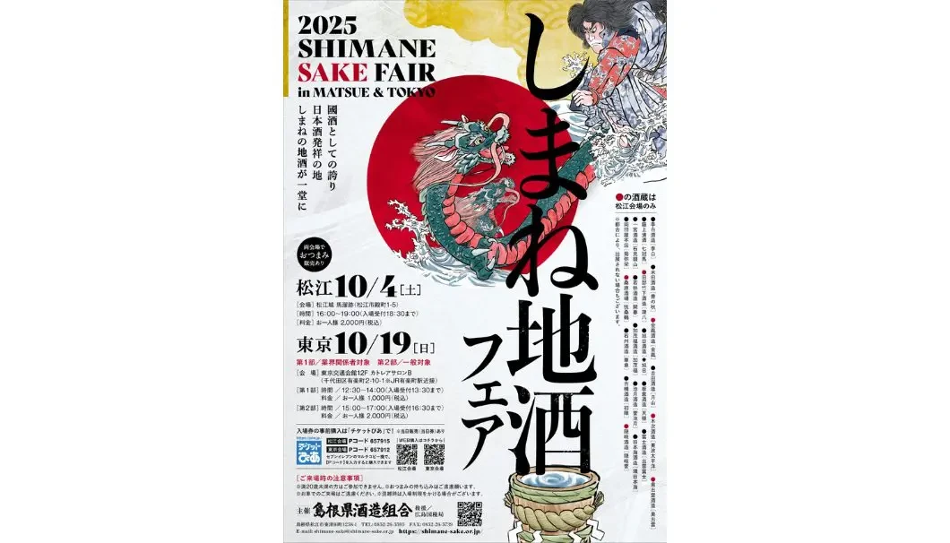 島根地酒博覽會將於10/4、10/19分別於島根、東京盛大登場 島根縣酒造組合(島根縣松江市)將舉辦集合島根縣特色地酒的日本酒活動「島根地酒博覽會」,活動時間為2025年10月4日(六)於松江城(島根縣松江市),以及 10 月 19 日(日)於東京交通會館(東京都千代田區)。 於東京會場舉辦的活動,將有來自島根縣的 15 家酒藏參加!