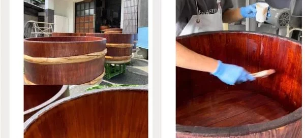酒造會以「kaki juice」(柿澀)保養木造麴室,藉此防潮防蟲。圖片來源:Foodie貓的讀酒筆記 幾年前在參觀酒造時,聽到導覽者提到他們每年都會以「kaki juice」保養木造麴室,藉此防潮防蟲。那時候,不太懂柿子汁為什麼可以保養木頭。後來,偶然發現原來 kaki juice 的日文是「柿澀」,很多酒造都會在釀造季節告一段落的大掃除後,將「柿澀」塗在木造建築、木製器具或是木質釀造桶內。