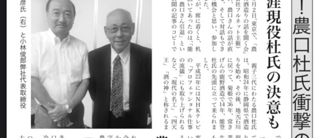 農曆年假前突然出了一則報導,是關於「農口酒造」「杜氏不在」的消息,描述現年高齡 84 歲的能登杜氏四天王 — 農口尚彥老爺爺突然引退的事件,本應由南部杜氏鷹木祐助繼任,但秋天時鷹木祐助先生也因為某些原因離開了,所以農口酒造目前是處於沒有杜氏(釀酒師)的狀態。