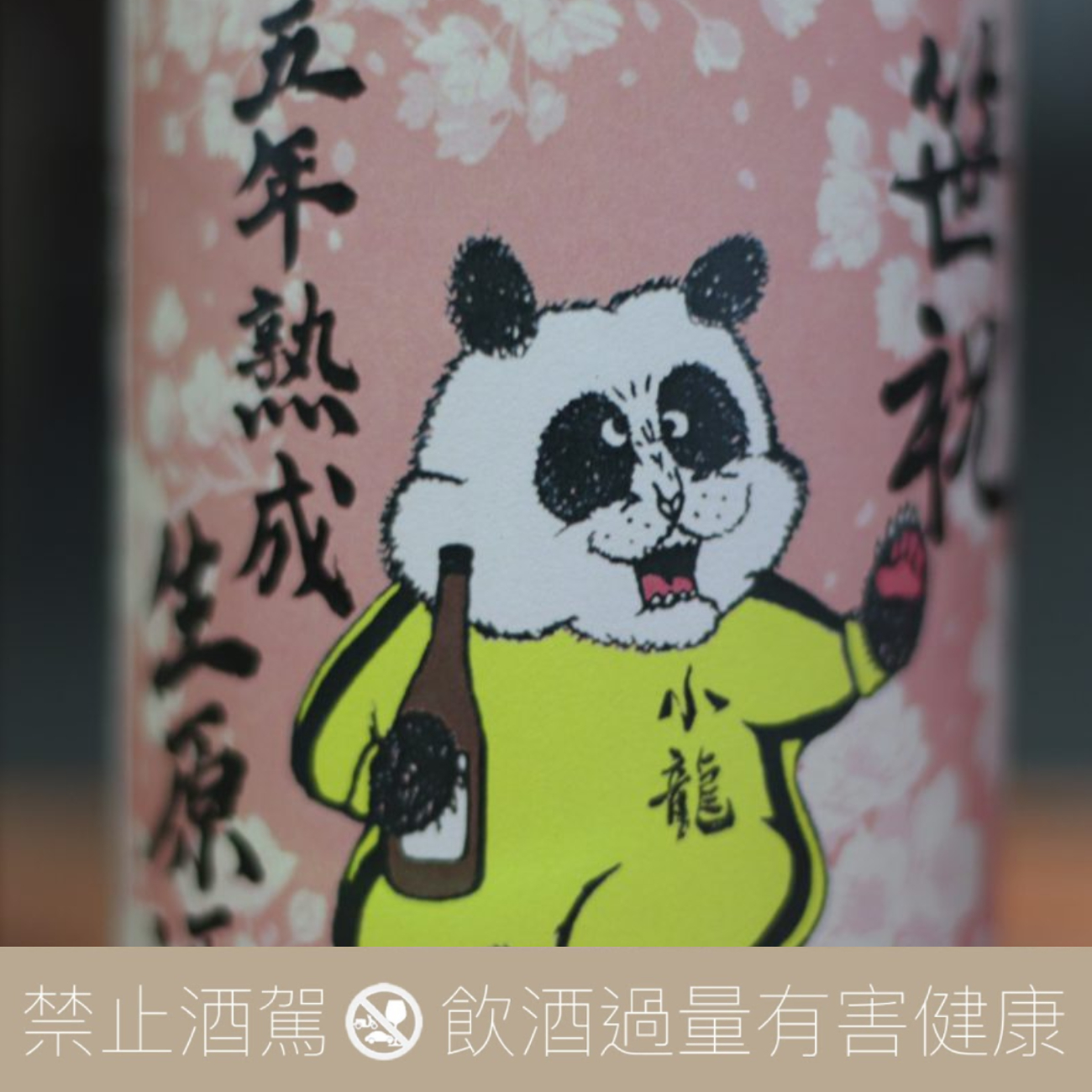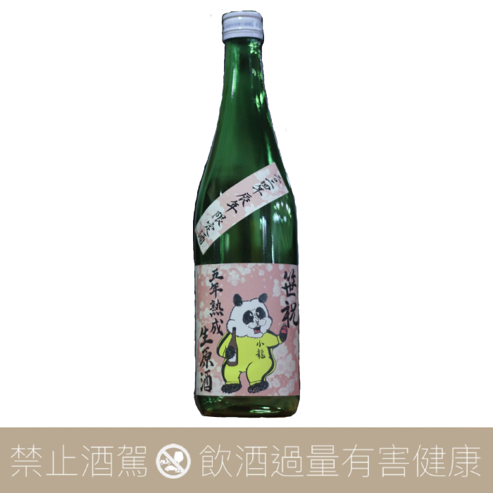 小龍熊貓穿著李小龍運動服,一手拿著一升瓶吶喊,經過5年熟成的純米生原酒,飽滿豐富享受豐富感的純米生原酒。