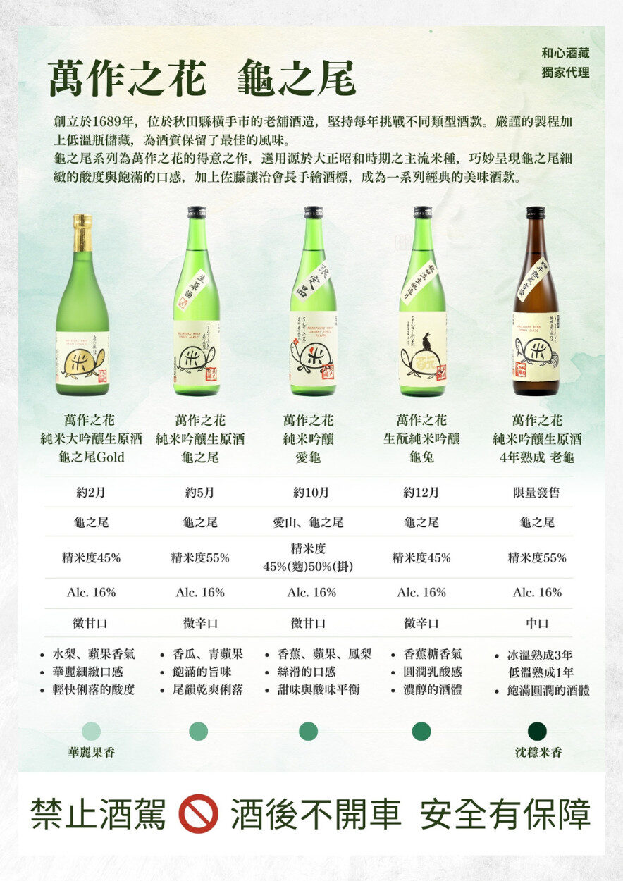 創立於1689年,位於秋田縣橫手市的老舖酒造,堅持每年挑戰釀造不同類型的酒款,嚴謹的製程加上低溫瓶儲藏,為酒質保留了最佳的風味。主力品牌萬作之花主打細膩酒體、雅緻口感的美學印象,新銳品牌,旨辛萬作則以清爽俐落兼具旨味濃醇的口感深植人心。