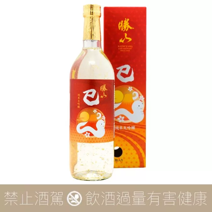 使用24k金的金箔,適合新年祝福禮及自用收藏,勝山乙巳蛇年干支純米大吟釀(金箔入り)為一年一造,每年年末才公開發售的限定品。為慶祝2025年的來臨,酒標設計以紅黃漸層搭配象徵蛇年的小白蛇,彰顯喜氣的同時不失可愛。