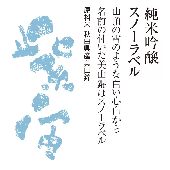 以名酒米「美山錦」所釀造的純米吟釀無濾過原酒。因為「美山錦」這個名稱源自於宛如積雪山頂般潔白的心白,我們將其命名為「Snow Label」。