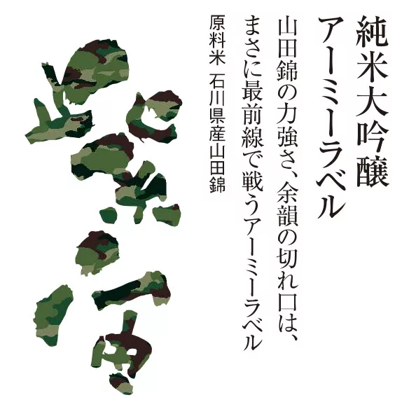 以石川縣栽種的酒米之王的「山田錦」所釀造的純米大吟釀。山田錦所帶來的豐富香氣與舒適餘韻,展現了日本酒最前線的風味表現,正是 Army Label 的寫照!