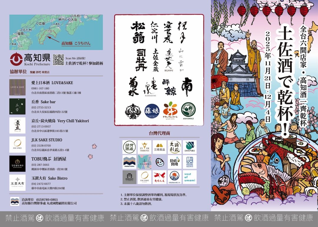 「土佐」是高知縣的古名,這個地區素以民風熱情善良,充滿活力著稱!來到高知縣,您會發現高知人超愛分享杯中好酒,讓彼此很快成為好朋友!2025年,高知縣十四家酒造把土佐的熱情與活力帶到台灣來,要用高知的美酒讓您感受土佐人的豪氣!