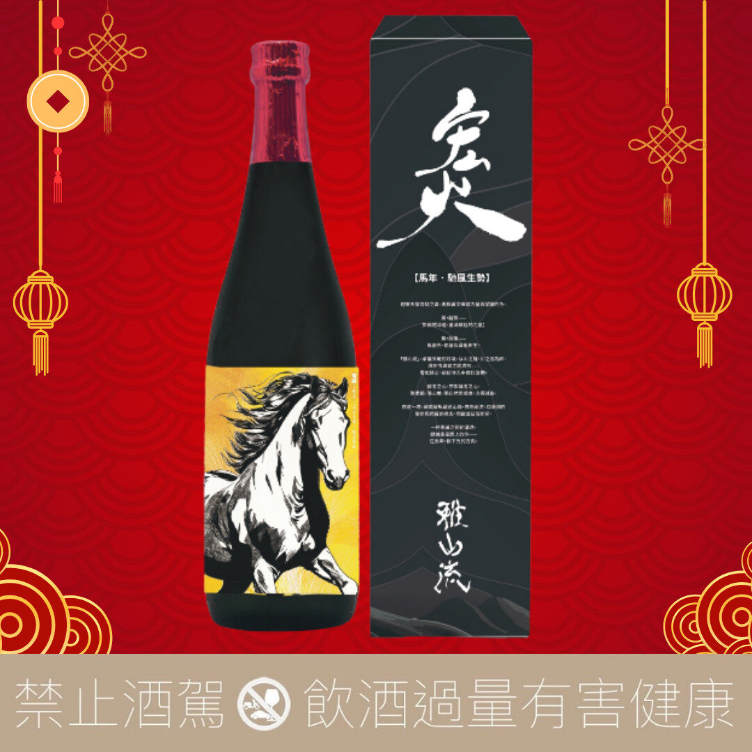 雅山流 2026 年干支酒,釀造出如光影流轉間的果香幻境。香氣華麗卻不喧鬧,口感如絲般滑順,透明中帶有深邃層次,是新年送禮的最佳選擇。一杯黑黃之間的清酒,獻給乘風而上的你,在馬年,飲下光的方向。
