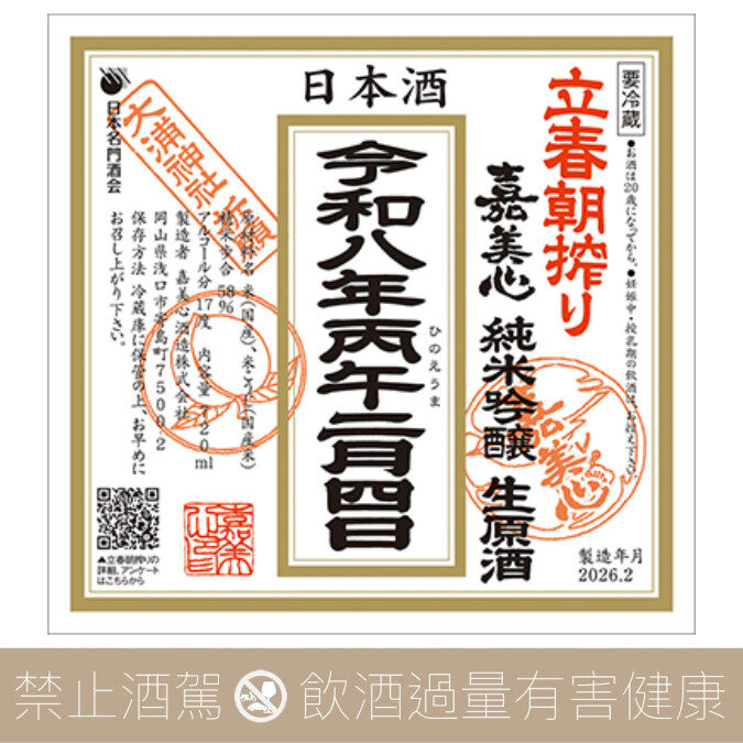 立春朝榨活動已進入第29年,這是2月4日春天鮮榨的限量酒,在當地神社祈禱一年無病息災和商業繁榮的限量酒 。