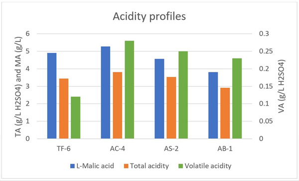 酸味是食物的基本味道之一,在蘋果酒中它可被歸類在有機酸家族的代表,蘋果果實中的主要酸是蘋果酸(約佔90%),而在蘋果酒中蘋果酸還會伴隨著乳酸和其他有機酸(如檸檬酸等)。