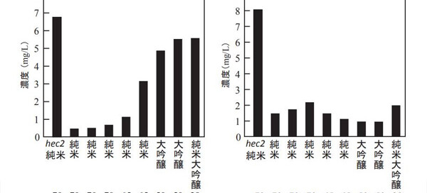 首先需要說明的是,這裡指的是具有特定吟釀香氣的酒。儘管只要符合法規,都可以被標示為吟釀酒,但這裡想討論的是精米對香氣的影響。 結論來說,米的精白越高,酵母生產的吟釀果香就越高,因為己酸乙酯和乙酸異戊酯的生物合成會受到來自米外層的不飽和脂肪酸的抑制。所以實際上以現在的研究發展來說,從稻米的成分改變是一個重點,另外開發不需要高精白就能產生香氣的酵母是一個釀造學的方向(這部分的各種,就留待下一次再來說吧,菊正宗與月桂冠在這方面做了許多努力,似乎也有相關的產品)。
